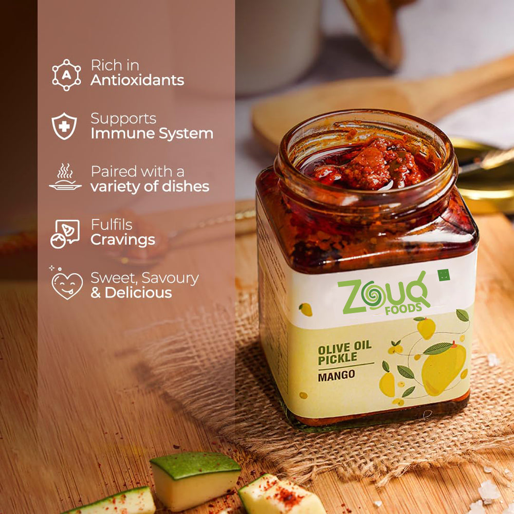 Mango Pickle - Savour the tangy tartness of raw mangoes blended with fragrant spices like mustard, chilli and turmeric powder. All soaked in 100% extra virgin olive oil.