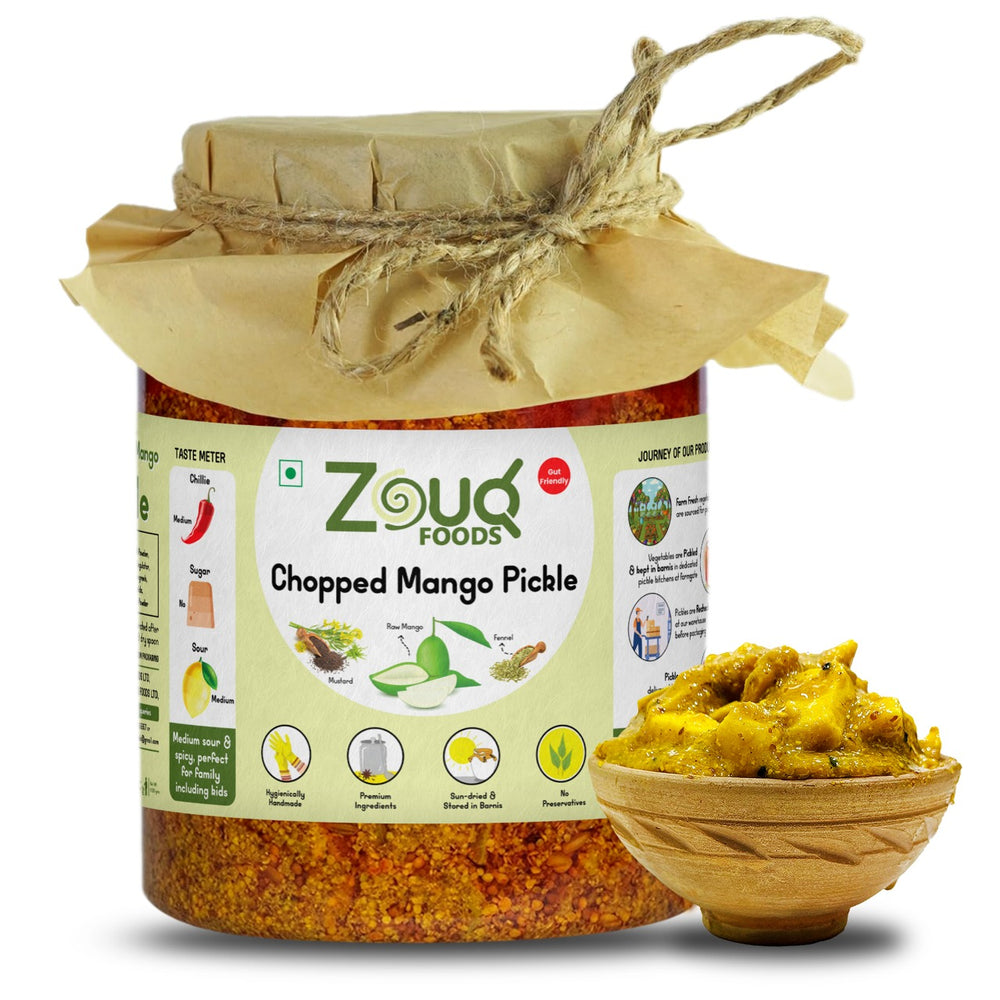 Zouq Foods brings you the authentic tang and spice of homemade-style Chopped Mango Pickle, crafted with farm-fresh raw mangoes, premium-grade spices, and zero preservatives. Packed in a 1.2kg eco-friendly plastic jar, this pickle is ideal for families who crave both taste and sustainability.